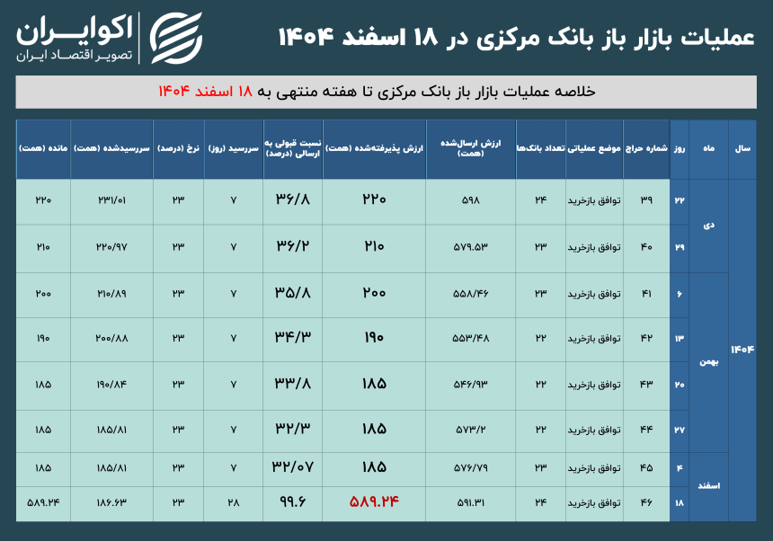 با این‌حال بعد از اینکه کشور در ۹ اسفندماه مورد حمله مشترک آمریکا و اسرائیل قرار گرفت، بانک مرکزی به علت شرایط خاص کشور از سیاست نسبتا انقباضی خود دست کشید و در آخرین عملیات سیاست پولی برگزار شده با تقریبا همه درخواست بانک‌ها موافقت کرده است. در ۱۸ اسفندماه ارزش سفارشات ارسال شده توسط بانک‌ها معادل ۵۹۱ هزار و ۳۱۰ میلیارد تومان بوده که بانک مرکزی با ۵۸۹ هزار و ۲۴۰ میلیارد تومان از این درخواست‌ها موافقت کرده است. به عبارتی درصد موافقت این نهاد با سفارشات بانکی ۹۹.۶ درصد برآورد شده است.