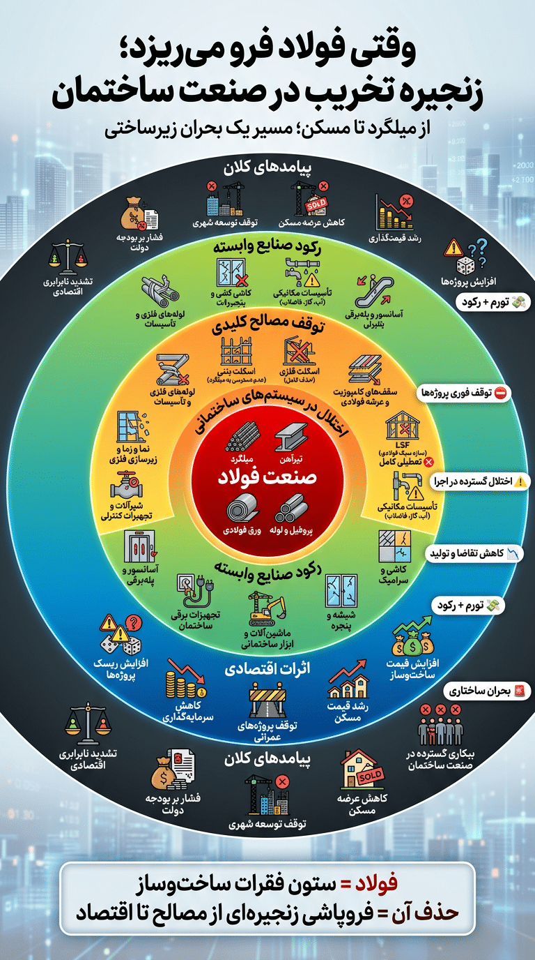 این زنجیره به همین جا ختم نمیشود؛ اختلال گسترده در سیستمهای ساختمانی مانند LSF، تاسیسات مکانیکی، HVAC و آسانسورها، رفتهرفته صنایع وابسته را نیز به رکود میکشاند. کاشی و سرامیک، شیشه، تجهیزات برقی و حتی ماشینآلات ساختمانی، همگی از این ضربه در امان نخواهند ماند. در نهایت، اثرات اقتصادی به شکل افزایش قیمت مسکن، تورم و رکود، سرمایهگذاری را کاهش داده و فشار بر بودجه دولت را مضاعف میکند. اوج این بحران، پیامدهای کلانی نظیر بیکاری گسترده، کاهش عرضه مسکن، توقف توسعه شهری و تشدید نابرابریهای اقتصادی است. فولاد تنها یک مصالح نیست؛ ستون فقرات توسعه و رفاه است.