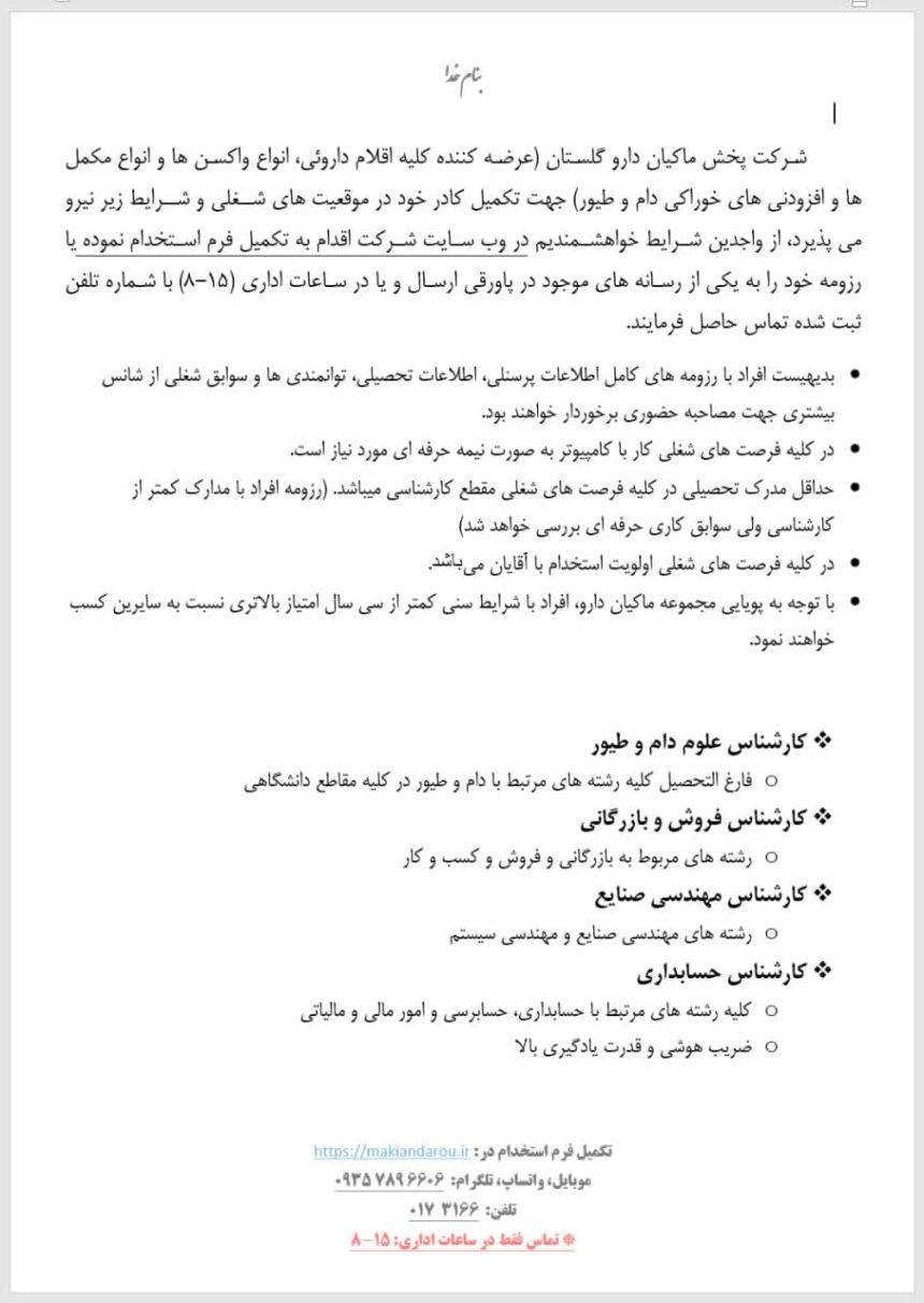 شرکت پخش ماکیان دارو گلستان در راستای تکمیل کادر خود، از میان افراد واجد شرایط در چند رده شغلی دعوت به همکاری میکند.